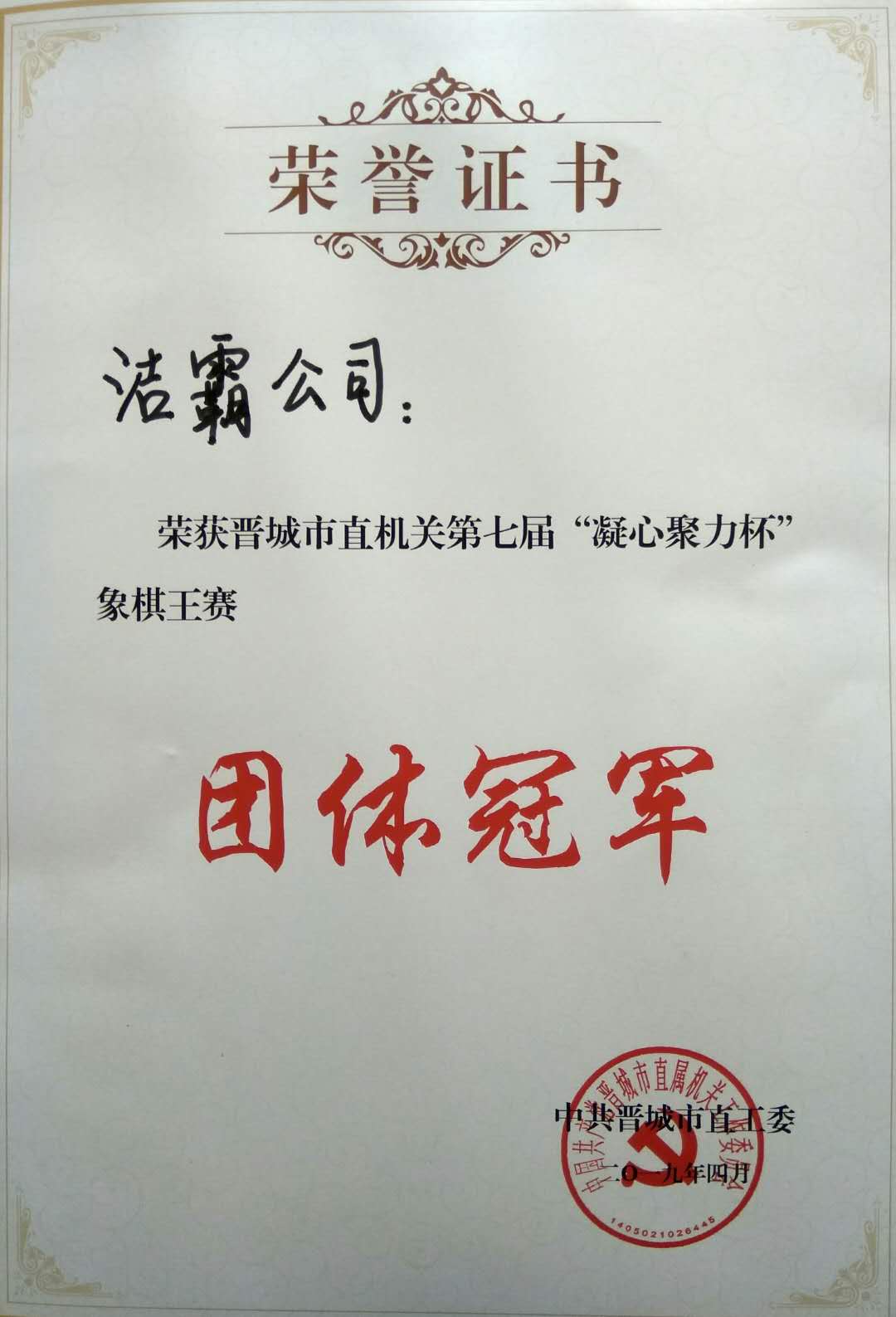 | 我公司榮獲晉城市直機關(guān)第七屆“凝心聚力杯”象棋王賽團體冠軍 |
