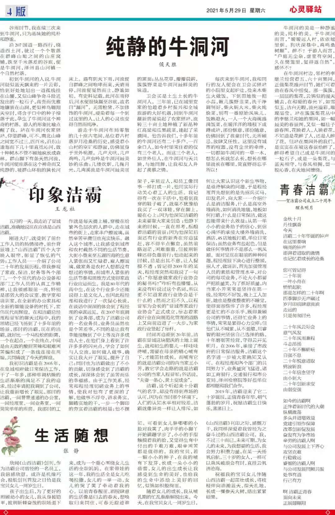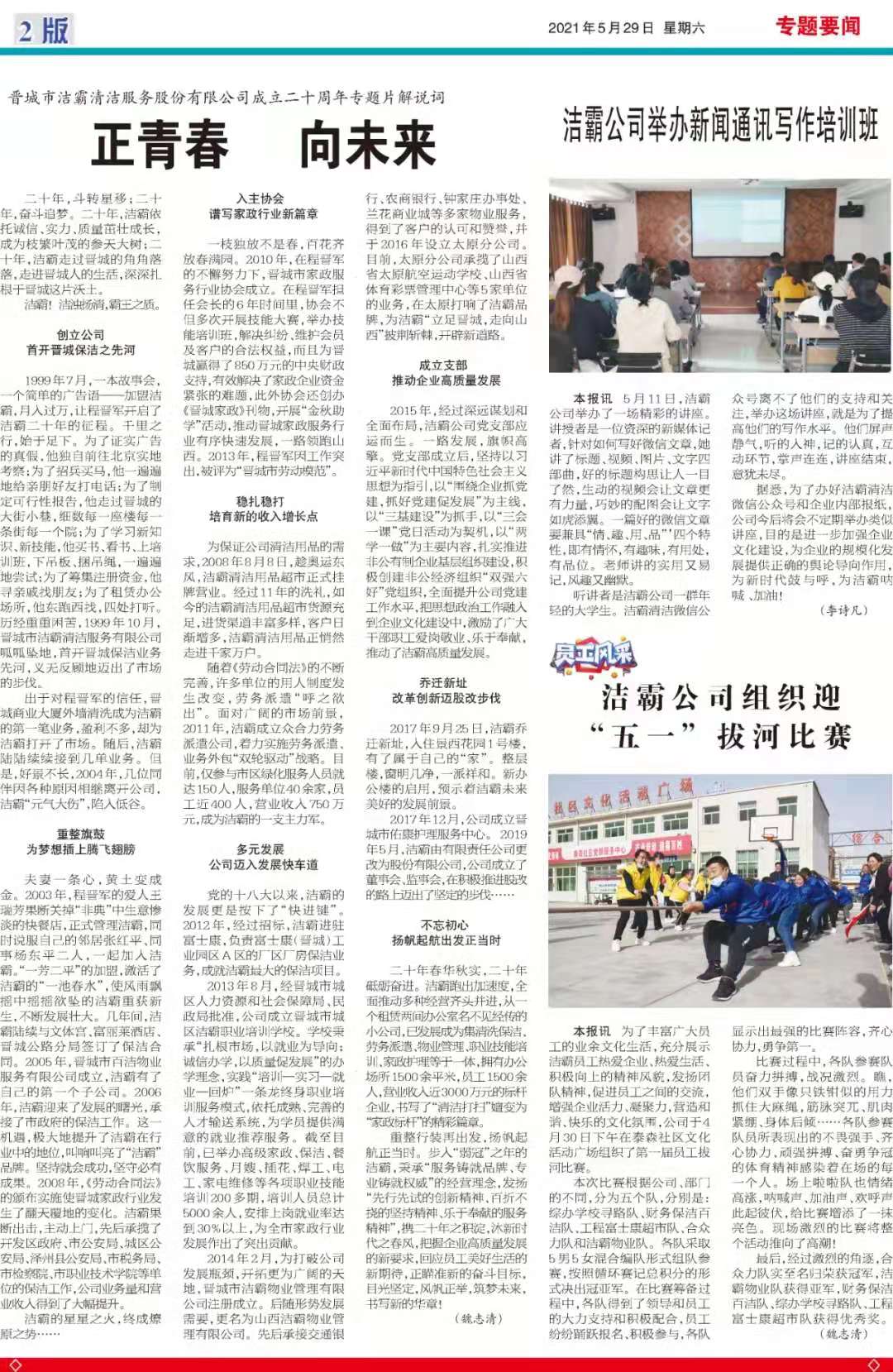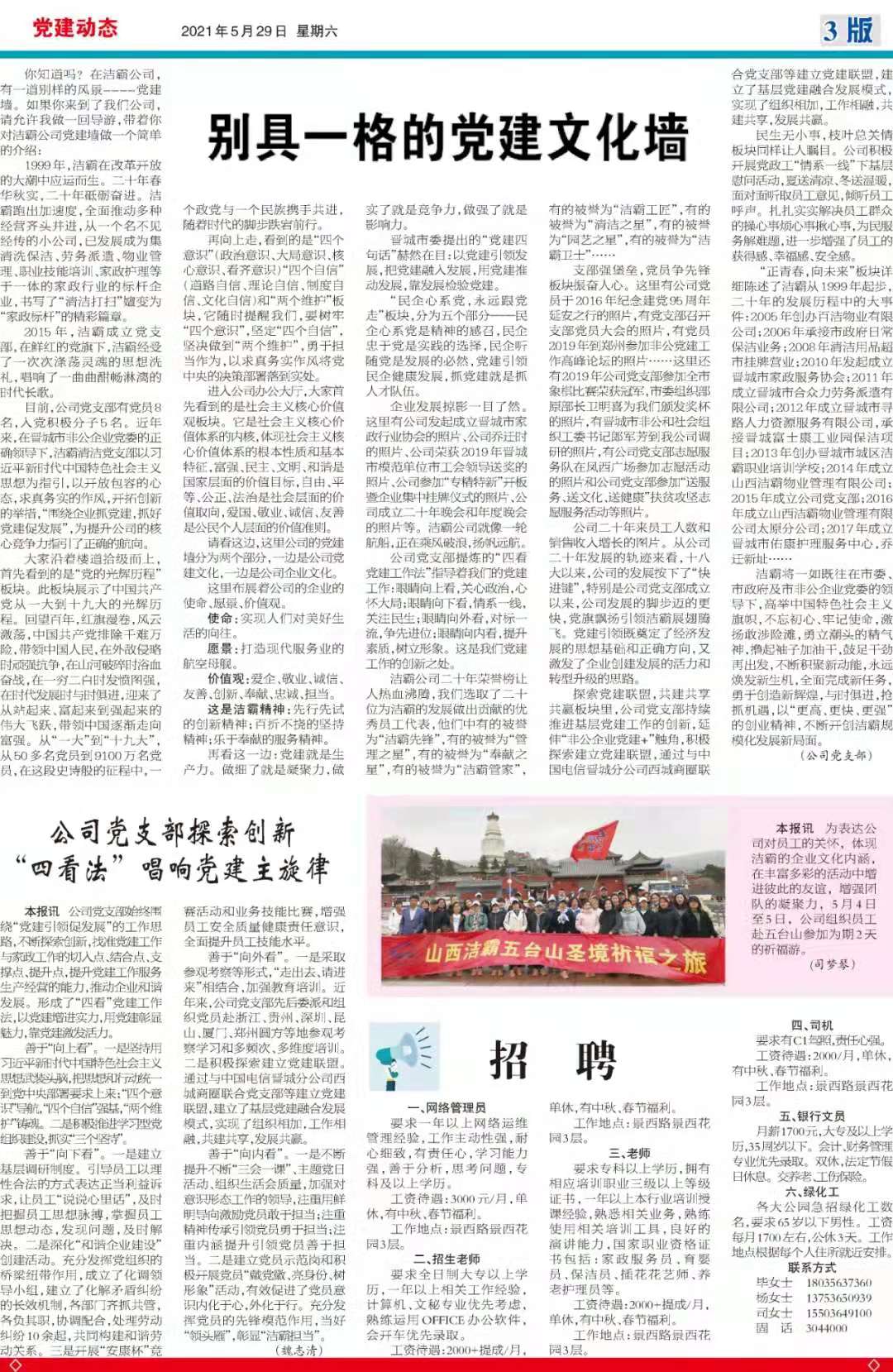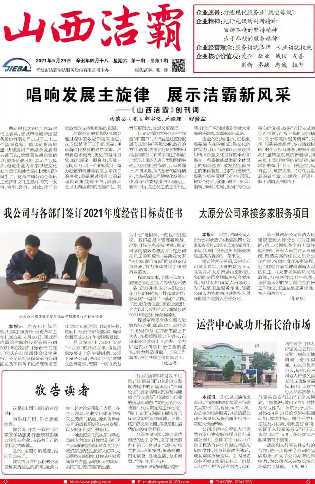 今天是2021年5月29日,經(jīng)過一個(gè)多月的緊張籌辦,《山西潔霸》報(bào)紙終于創(chuàng)刊啦!這是潔霸人的一件大喜事,也是潔霸人的驕傲!伴隨著《山西潔霸》紙質(zhì)版的內(nèi)部發(fā)行,電子版也同步與你見面了。希望你能通過這個(gè)宣傳窗口,更好地走近潔霸,了解潔霸,關(guān)注潔霸,支持潔霸。