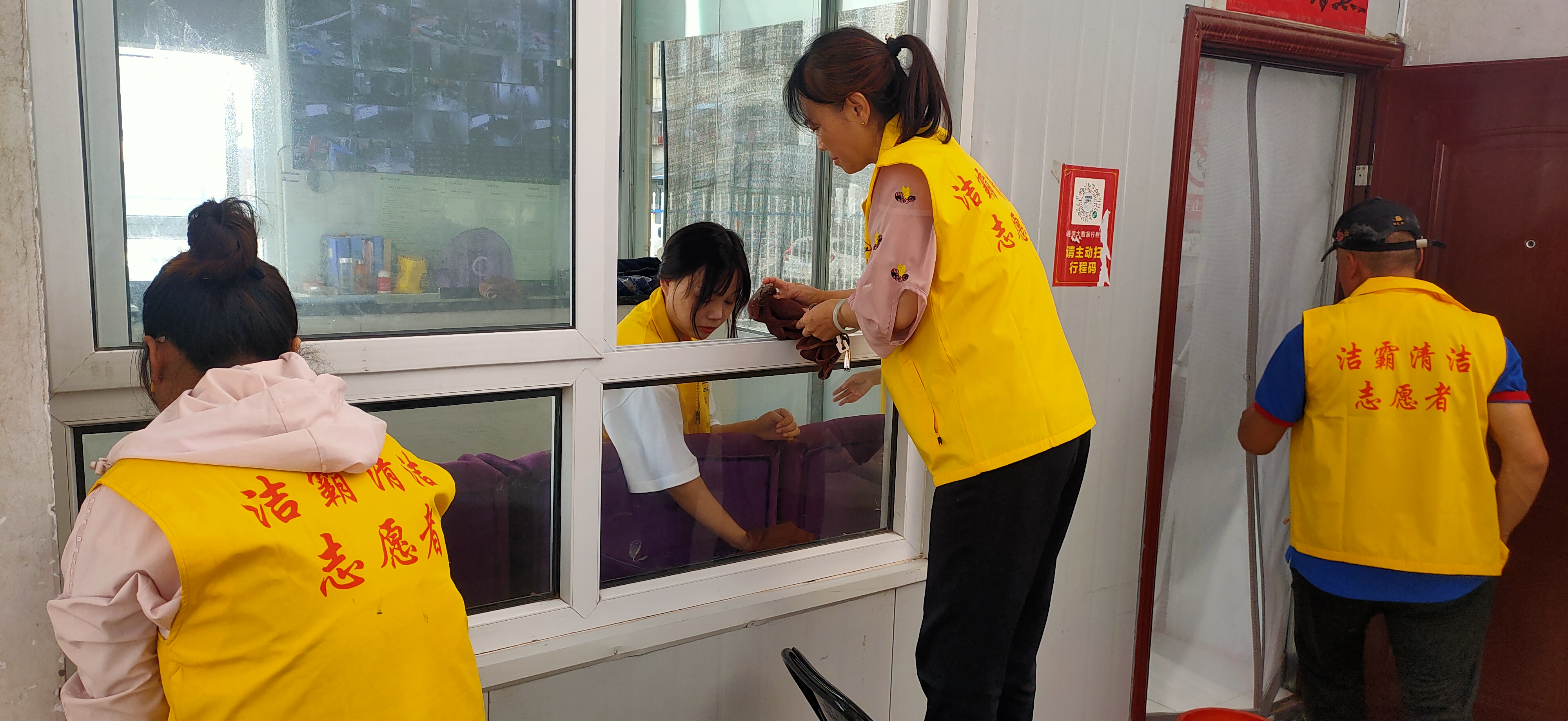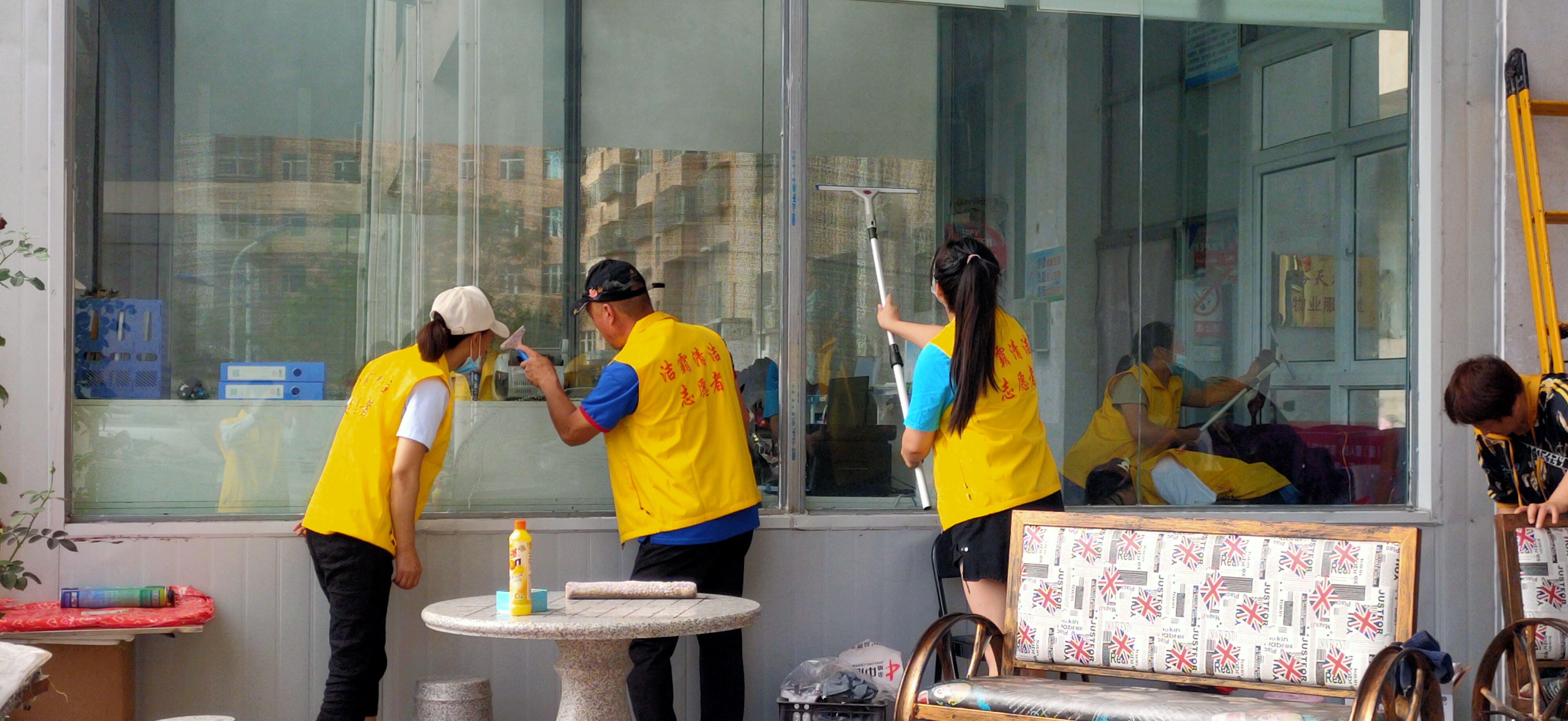 活動現(xiàn)場,志愿者身穿黃色馬甲,自帶玻璃擦、毛巾、笤帚、簸箕清潔工具,對小區(qū)物業(yè)服務(wù)處及小區(qū)環(huán)境進(jìn)行清潔打掃。他們有的清掃小區(qū)天臺上的垃圾;有的清理樓道及公共設(shè)施上的牛皮癬;有的擦拭門衛(wèi)的玻璃;有的清洗紗窗;有的清洗物業(yè)服務(wù)處的玻璃幕墻……志愿者個個干勁十足,不怕臟、不怕累,經(jīng)過一個多小時的團(tuán)結(jié)協(xié)作,小區(qū)環(huán)境煥然一新。