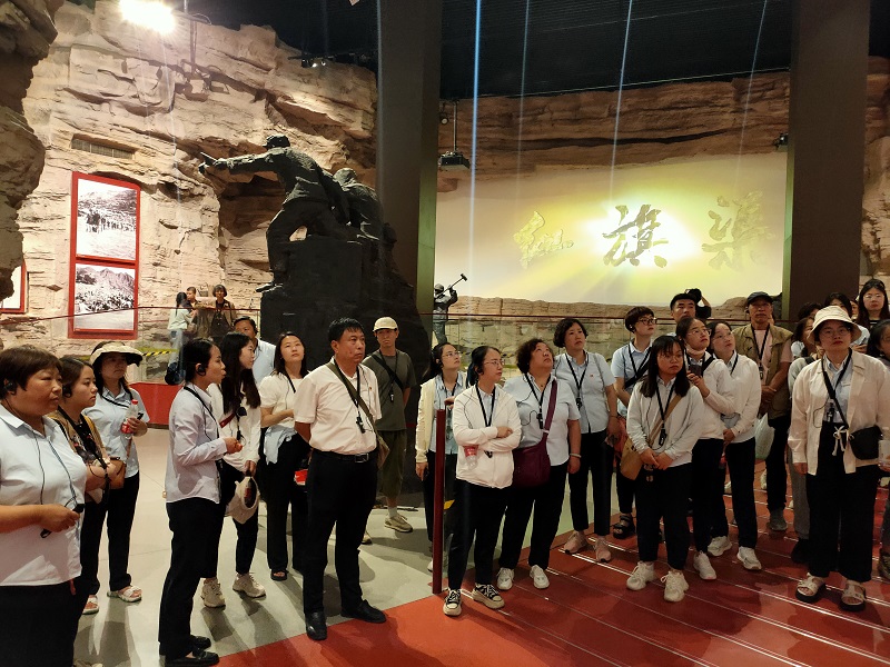 走進(jìn)紅旗渠紀(jì)念館,大家跟隨講解員的腳步,在千年旱魔,世代抗?fàn);紅旗引領(lǐng),創(chuàng)造奇跡;英雄人民,太行豐碑;山河巨變,實(shí)現(xiàn)夢(mèng)想;繼往開來(lái),精神永恒五個(gè)部分逐一駐足學(xué)習(xí),通過(guò)一件件珍貴的物品,一幅幅生動(dòng)的圖片、一幀幀震撼的畫面、一個(gè)個(gè)感人的故事,讓大家身臨其境感受到林州人民建造人工天河時(shí)不畏艱險(xiǎn),頑強(qiáng)拼搏,緊靠一錘一鏟削平1250座山頭、鑿?fù)?11個(gè)隧道、架設(shè)151個(gè)渡槽的恢弘場(chǎng)景。在場(chǎng)的各位都深深地被“自力更生、艱苦創(chuàng)業(yè)、團(tuán)結(jié)協(xié)作、無(wú)私奉獻(xiàn)”的紅旗渠精神所感動(dòng),切實(shí)感受到中華民族勤勞堅(jiān)韌的優(yōu)良傳統(tǒng),領(lǐng)悟社會(huì)主義是干出來(lái)的,新時(shí)代是奮斗出來(lái)的。