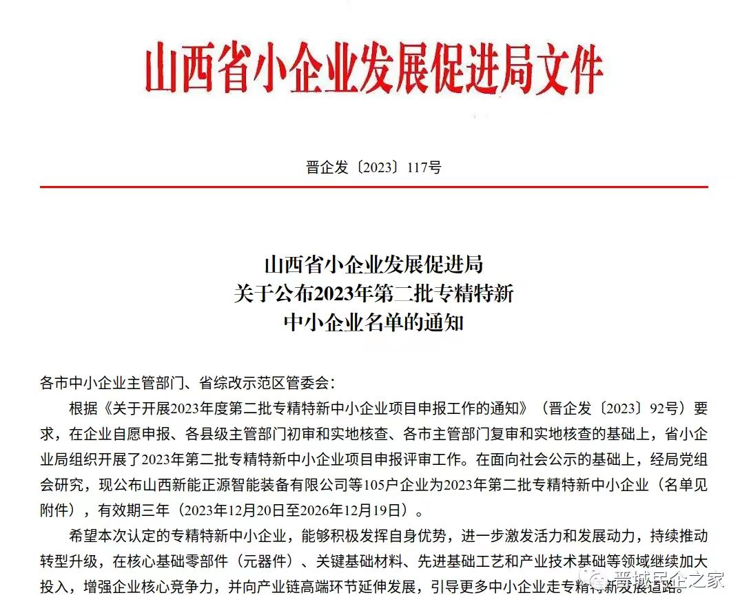 近日,山西省小企業(yè)發(fā)展促進(jìn)局公布了2023年第二批專精特新中小企業(yè)名單(全省共105家,其中晉城市9家),我公司成功上榜。
