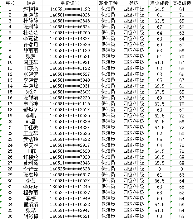 晉城市潔霸清潔服務(wù)股份有限公司職業(yè)技能等級認(rèn)定中心現(xiàn)將2024523日認(rèn)定人員成績公示如下: