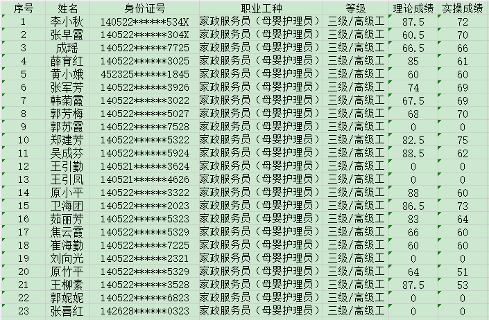 2024520日上午第13批家政服務(wù)員高級(jí)認(rèn)定人員成績(jī)公示