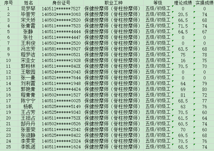 晉城市潔霸清潔服務(wù)股份有限公司職業(yè)技能等級認(rèn)定中心2024年5月24日第2批保健按摩師初級認(rèn)定人員成績公示