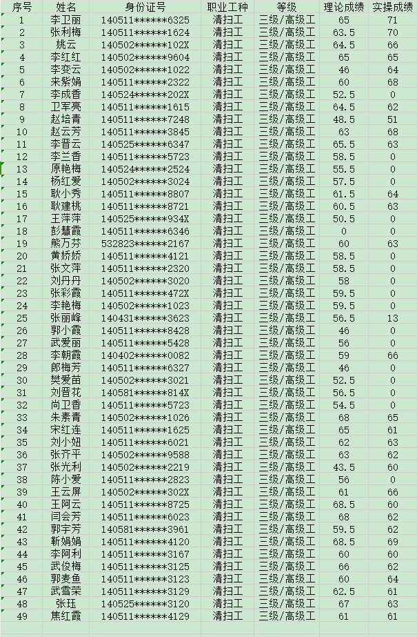晉城市潔霸清潔服務(wù)股份有限公司職業(yè)技能等級認定中心2024年8月3日第8批保潔員高級認定人員成績公示