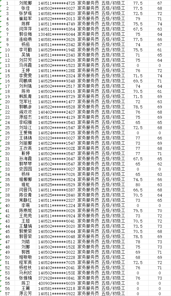 晉城市潔霸清潔服務(wù)股份有限公司職業(yè)技能等級(jí)認(rèn)定中心現(xiàn)將2024年9月21日認(rèn)定人員成績(jī)公示如下: